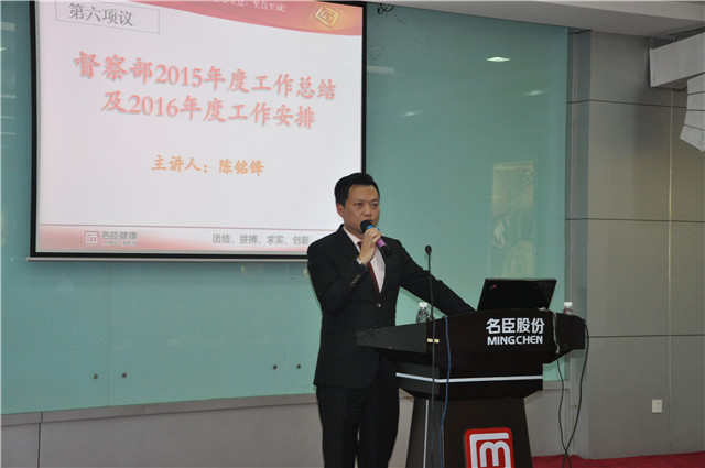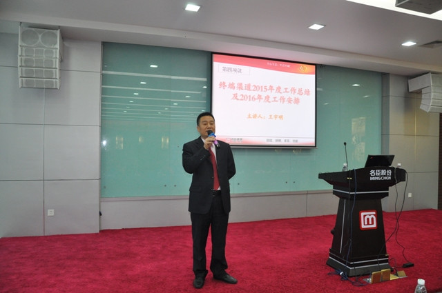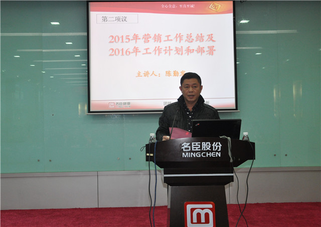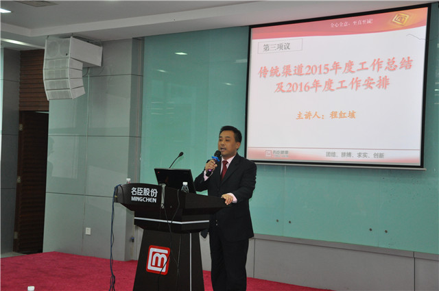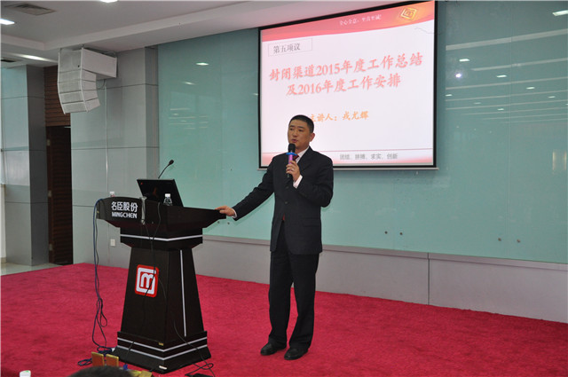 公司董事长陈勤发在会上讲话 公司董事长、总经理陈勤发在会上讲话,对公司2015年营销工作做了回顾和总结,对全司各渠道、各级营销精英过去一年,在艰苦的市场环境下,迎难而上,锐意进取,辛勤耕耘,不懈努力,推进了公司各项业务的持续、稳步、健康发展,予以充分肯定,并表示衷心的感谢。同时,对当前国内经济形势、行业市场作了分析,明确了公司2016年营销发展战略和发展目标,并对新年全司营销工作做了全面的部署,提出具体要求和期望。陈勤发董事长希望公司营销系统各级员工振奋精神,精心管理,用心工作,进一步加强营销队伍建设,加强渠道建设,切实加强品牌推广力度,加强新产品开发,加大市场投入,进一步提升产品品质和服务品质,深耕细作,推动各项业务再上新台阶,再创新辉煌。 公司各渠道营销中心总监、市场督察部经理,先后在会上就新年的工作计划、工作目标、工作思路、主要工作措施作了工作报告。