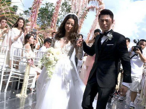 婚礼现场,林心如身穿白纱,披着一头靓丽的秀发,挽起霍建华的手,幸福甜蜜。