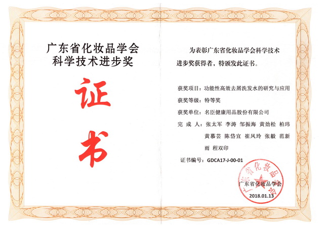 | 1月13日,广东省化妆品学会化妆品科学技术进步奖励大会在广州国际生物岛隆重举行。名臣头皮健康护理研究团队完成的“功能性高效去屑洗发水的研究和应用”项目,经形式审查、专家评分、理事会表决等环节,从全省50多个申报项目中脱颖而出,获得广东省化妆品学会科技进步奖特等奖。 该获奖项目主要根据引发头皮微生态失调的常驻菌(马拉色菌)的生长特点,从油水两相同时输送不利于该菌过度繁殖的成分,在头皮表面建立不利于该菌过度生长的环境,从而控制其数量恢复到正常水平。该项目大幅降低了常规使用去屑剂的浓度,与此同时还根据头发物理特性,采用极高粘度调理剂,实现了既让头发柔顺也使头发干爽的消费者体验。该项目依照规范科技成果认定的要求组织了国内专家进行成果鉴定。 名臣头皮健康护理研究团队是公司最早成立的专业化研究团队之一,长期从事头发、头皮健康护理研究工作。在发展中不断壮大积淀,对于头发、头皮健康护理形成了丰富的研究经验、比较完备的理论基础和研究软硬件条件。近年来广泛开展对头皮健康护理的科学研究,尤其在引发头屑、头痒、头皮敏感、头皮屏障功能修复等问题的原因和机制上形成了新的认识和解决方案。在整合生物技术、头皮微生态研究、头皮皮脂腺发育、毛囊发育和复苏等方面获得大量崭新的认识。该奖项的获得实现名臣公司科研工作特等奖项级别的“零”突破,极大鼓舞名臣上下所有创研人员的工作潜能和工作热情。