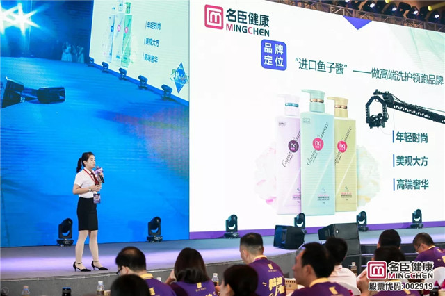 名臣健康终端事业部付红专女士在会上对产品进行介绍▲ 此次活动中,名臣健康新品“尊贵时尚鱼子酱系列”、“大众沙龙级黑精美发系列”、“美王洗护及护肤系列”一一闪耀登场,惊艳全场!名臣健康终端事业部推广总监付红专女士对产品进行了详细介绍,其精美时尚外观设计,珍稀产品成分和全新洗护概念,让经销商们耳目一新,交口称赞。